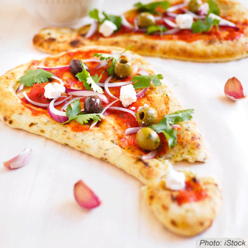 6. Top flatbread with marinara sauce, tomatoes, artichoke hearts, olives, onions, chickpeas and feta cheese.