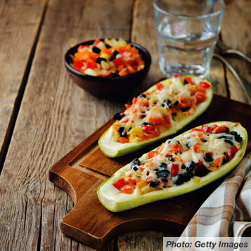 5. Once warm, scoop mixture into prepared zucchini boats.