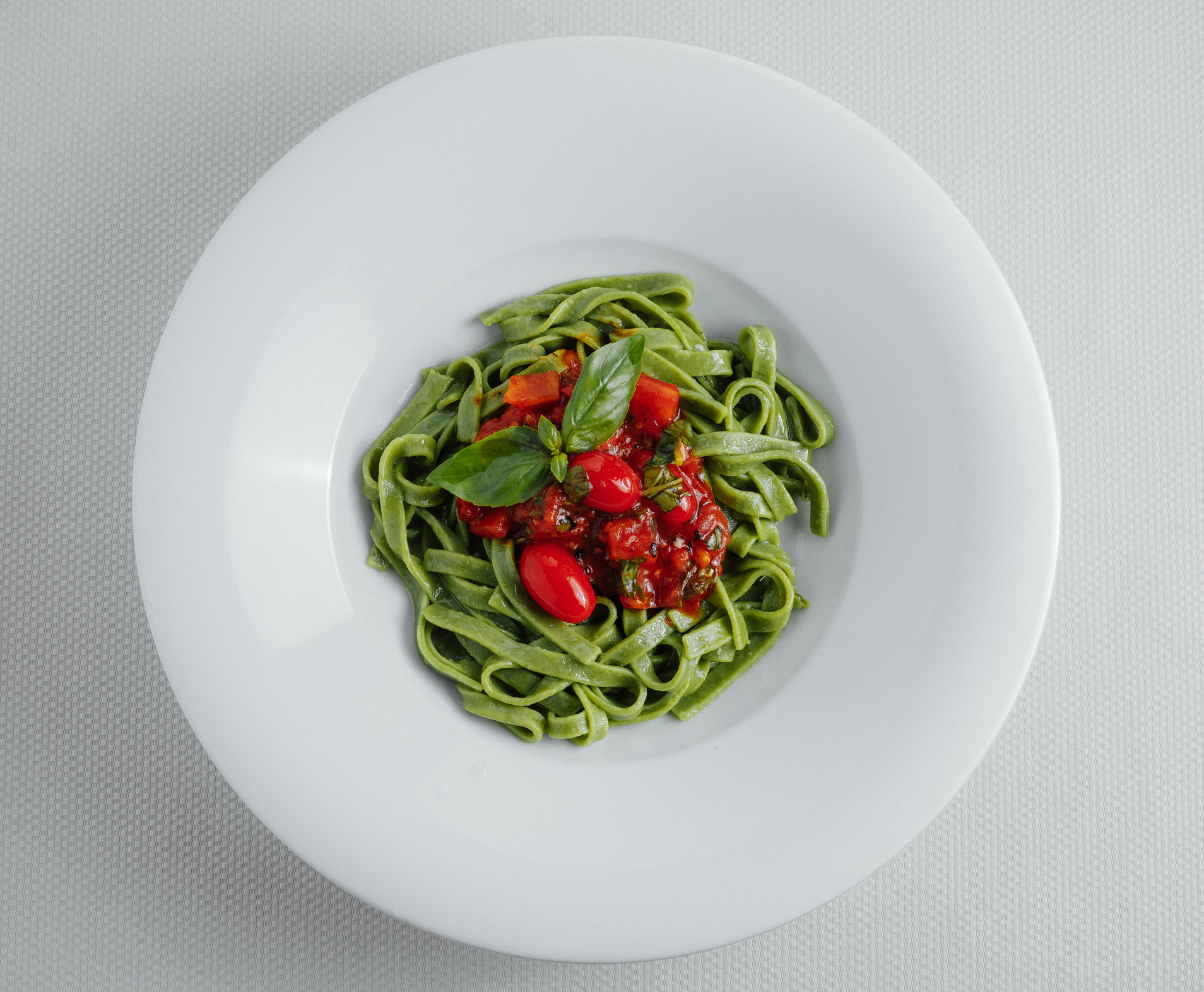 This vibrant, protein-packed dish combines edamame fettuccine with fresh spinach and juicy tomatoes for a wholesome, delicious meal.