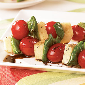 1. Thread tomatoes, basil leaves, and mozzarella cheese cubes alternately onto 10 (6-inch) wooden skewers. Place skewers on a serving platter.