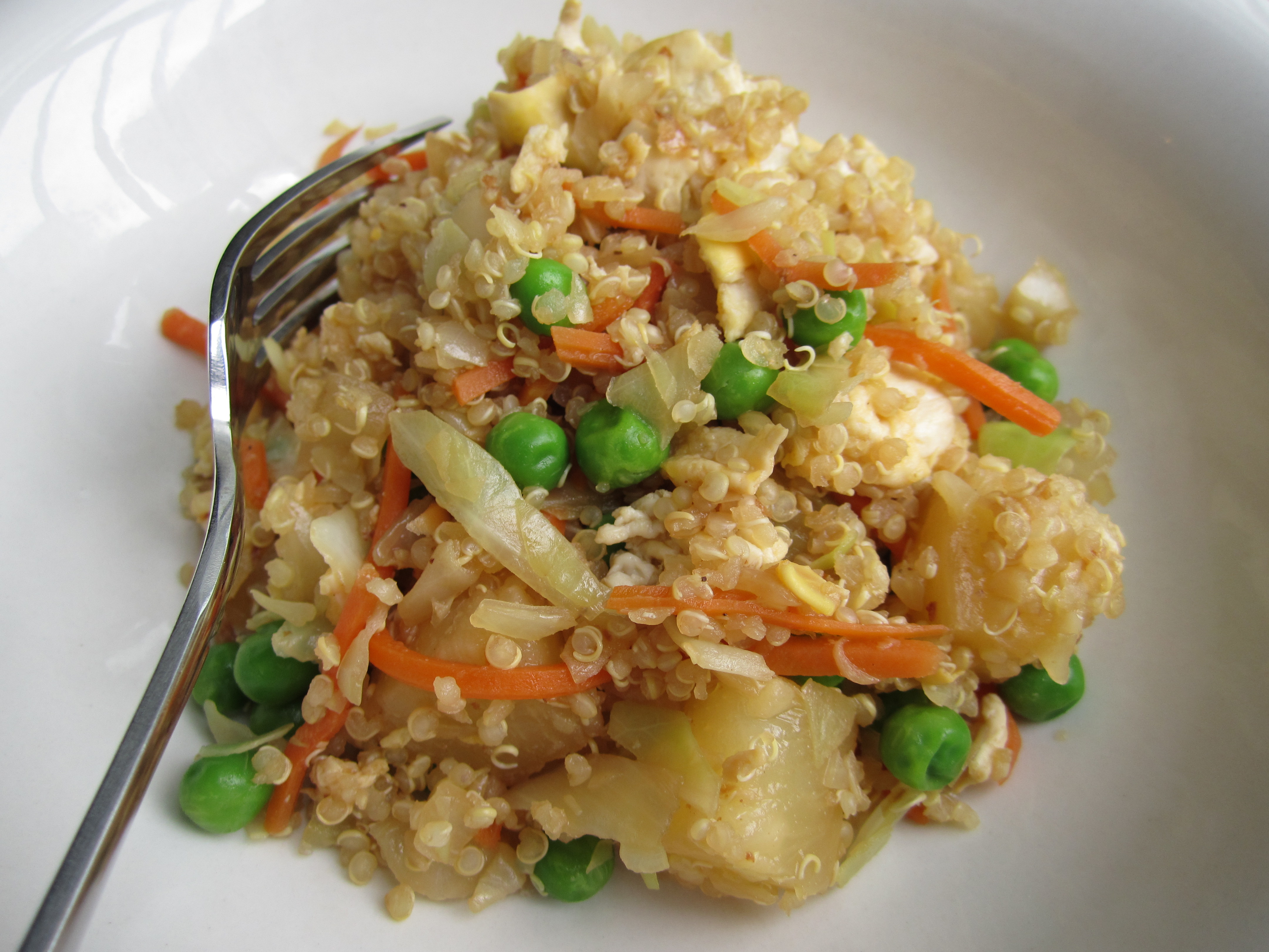 - Transfer cooked quinoa to large serving bowl. Transfer vegetable mixture from pan into bowl with quinoa and stir in soy sauce until well combined.