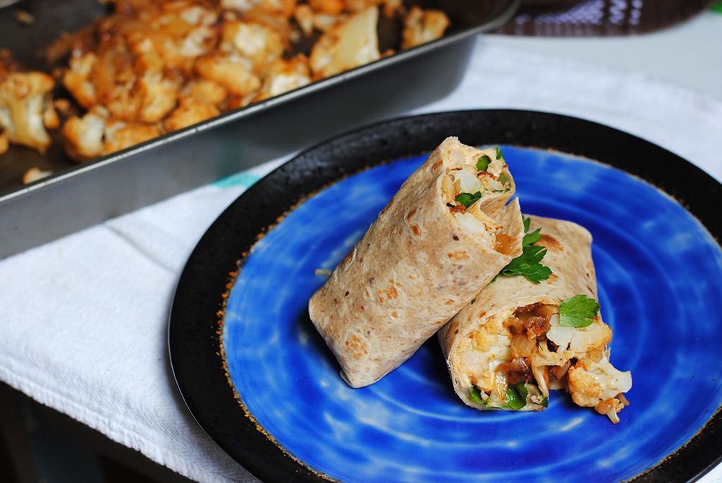 4. To serve, take 1/4 of the eggplant spread and divide it among the four lavash or tortilla wraps, spreading it in a smooth layer. Divide the cauliflower amongst the wraps and arrange in an even line across each wrap. Sprinkle with parsley and mint. Roll the wraps up and enjoy. To take the wraps to go, wrap them up in wax paper.