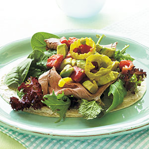 2. Combine tomato, pepper rings, and avocado in a medium bowl; toss gently. Top beef evenly with tomato mixture.
