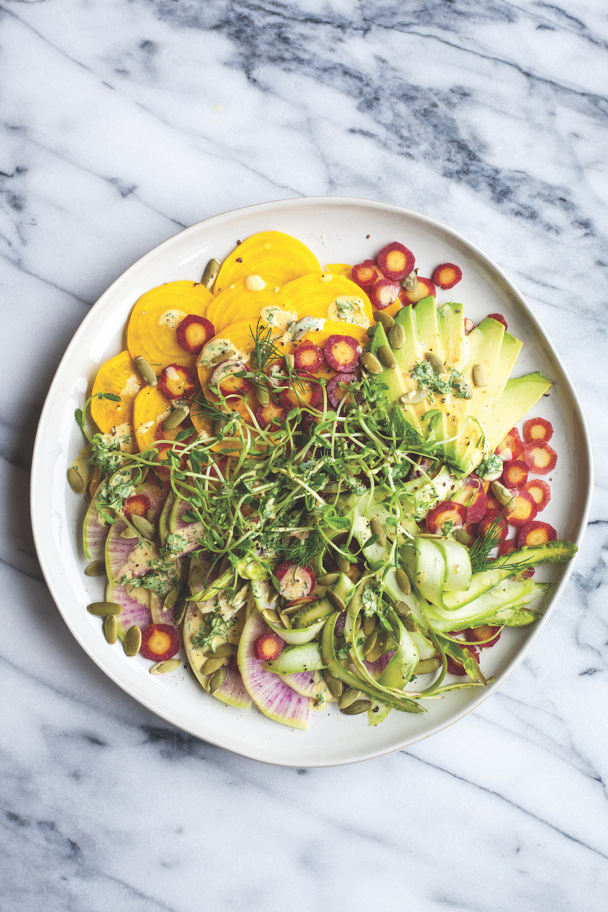 2. Arrange the asparagus, carrot, radishes, beet, avocado, and pea shoots on a plate. Drizzle with the dressing and sprinkle with pumpkin seeds.