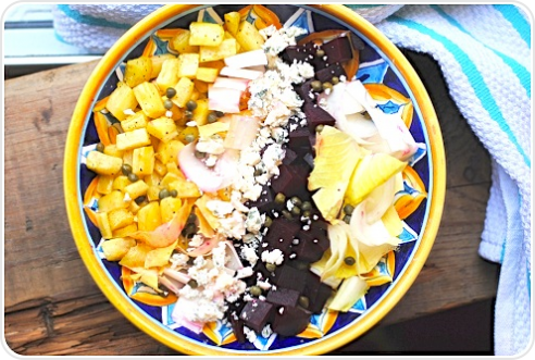 4. To assemble the salad, divide the ingredients in half and arrange beets, endive, parsnips, and blue cheese in bowls. Top with shallots and capers. Serve with dressing on the side.