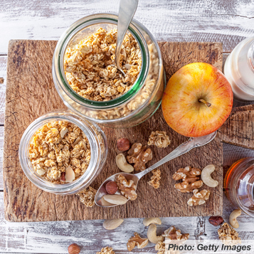 7. Spread 1/2 the apple slices with peanut butter and sprinkle with granola. Top with remaining apple slices, pressing down gently.